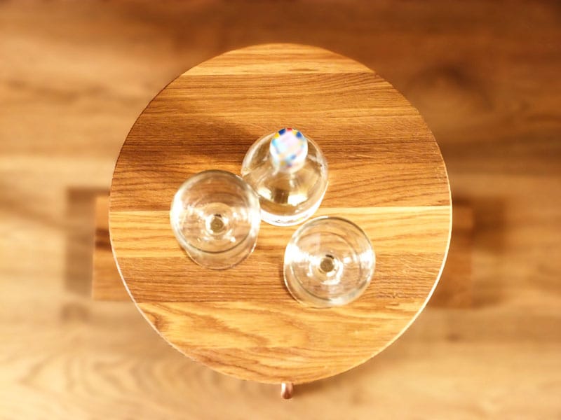 The table leg is made from solid laminated oak and a copper tube with a diameter of 15 mm.